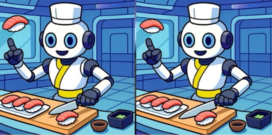 Οι εικόνες που παρουσιάζονται εδώ απεικονίζουν ένα ρομπότ σούσι. Με την πρώτη ματιά, οι δύο εικόνες φαίνονται ακριβώς ίδιες, αλλά υπάρχουν τρεις μικρές διαφορές μεταξύ τους.