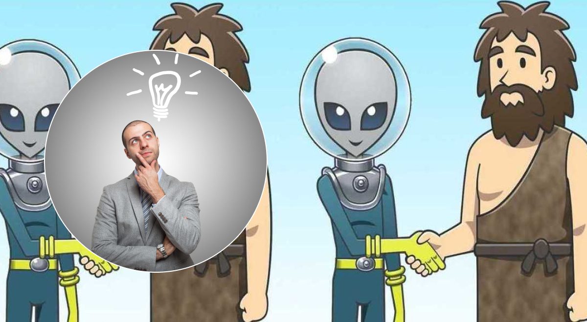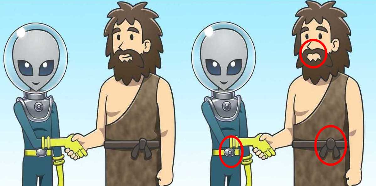 Στην εικόνα που παρουσιάζεται, μπορείτε να παρατηρήσετε δύο πανομοιότυπους εξωγήινους και δύο ανθρώπους των σπηλαίων.