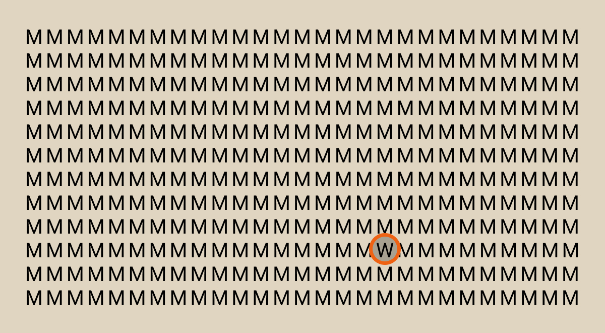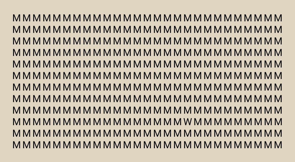 Στον επόμενο γρίφο θα πρέπει να βρείτε το γράμμα W ανάμεσα σε έναν μεγάλο αριθμό γραμμάτων Μ. Για να βρείτε αυτό το γράμμα θα πρέπει να συγκεντρώσετε όλη σας την προσοχή, γιατί ο γρίφος είναι πολύ καλά κρυμμένος.
