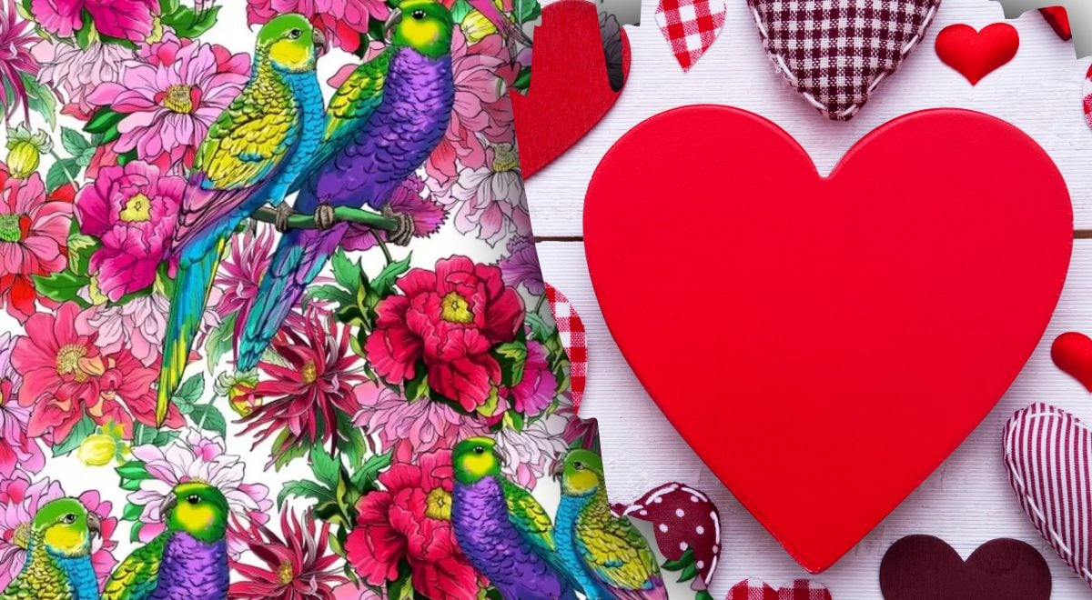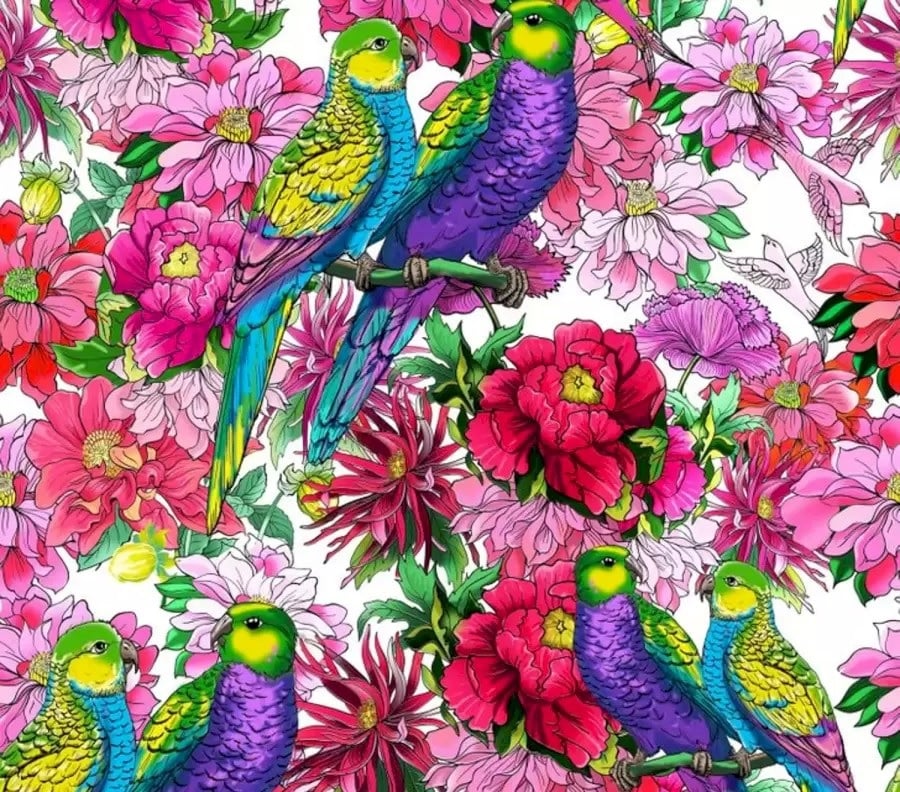 Μπροστά στα μάτια σας – μια φωτεινή εικόνα με πολλά λουλούδια και παπαγάλους. Τα πουλιά κάθονται σε ζευγάρια ανάμεσα στα λουλούδια. Και σε αυτή τη ρομαντική ατμόσφαιρα κάπου κρυμμένη καρδιά. Πού ακριβώς βρίσκεται δεν θα είστε σε θέση να δείτε.